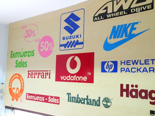 Για ακόμα πιο διακριτική παρουσία προτείνεται το αυτοκόλλητο αμμοβολής όπου αντικατέστησε σχεδόν ολοκληρωτικά την αμμοβολή υαλοπινάκων για διαφημιστικούς λόγους.